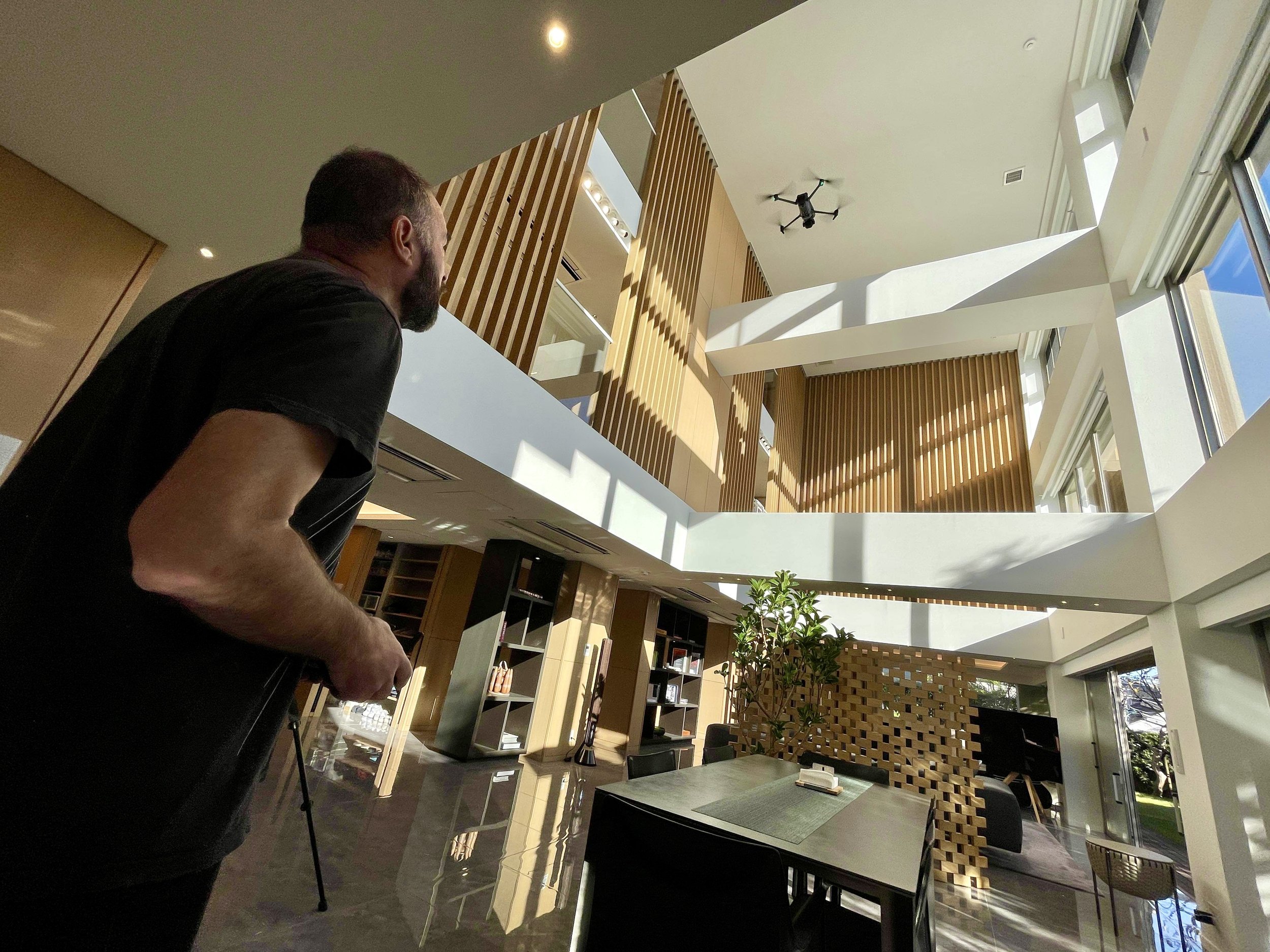 With the correct permissions obtained we were able to get some overhead shots of the residence from above and some shots over Yoyogi park to the city to give a sense of the location. We also got a few inside the building, in the central atrium, although as these were inside no permissions were needed for these ones. We flew the Mavic 3 Pro Cine, filming in ProRes.